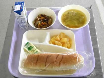 今日の献立は、大型コッペパン、ソフトマーガリン、牛乳、なすのミートグラタン、鶏肉と野菜のスープ、白桃(缶)でした。