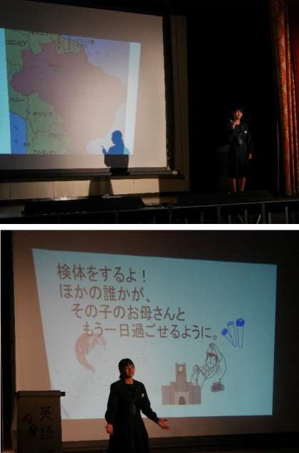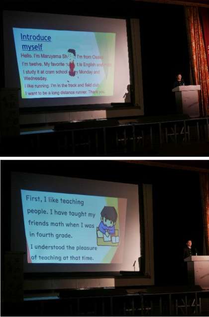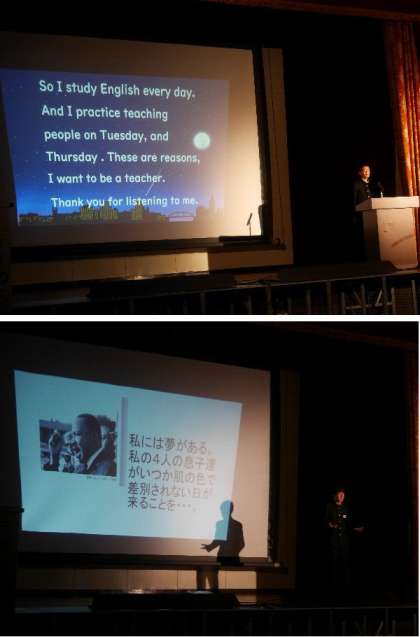 舞台の部の2つ目は、英語科による各学年からの暗唱でした。手振り身振りで長い文をわかりやすい英語で発表してくれました。