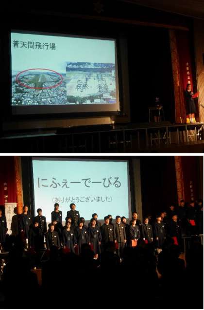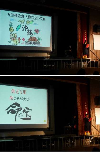 1年生は展示作品「沖縄〜命どぅ宝〜」をつくりました。作品づくりで調べたことなどを舞台で発表してくれました。