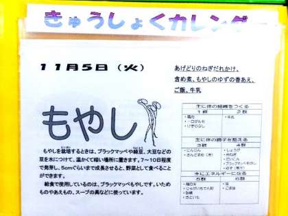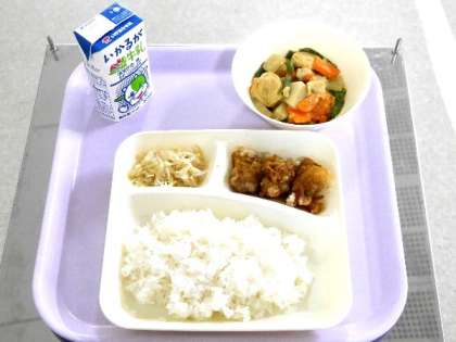 今日の献立は、ご飯、あげどりのねぎだれかけ、含め煮、もやしのゆずの香あ、牛乳でした。