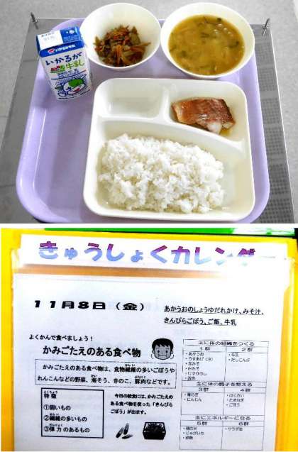 今日の献立は、ご飯、赤魚の醤油だれかけ、みそ汁、きんぴらごぼう、牛乳でした。元気アップボランティアさんに毎日おせわになっています。ありがとうございます。