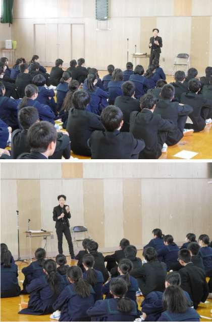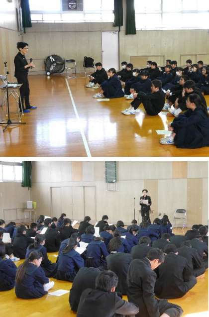 講師の先生にきていただき、3年生で男女共生についてお話していただきました。人を好きになって、異性とのつきあいのなかでおこるデートDVについて、具体的に性にかかわるお話をしていただきました。生徒たちは真剣に聞いています。