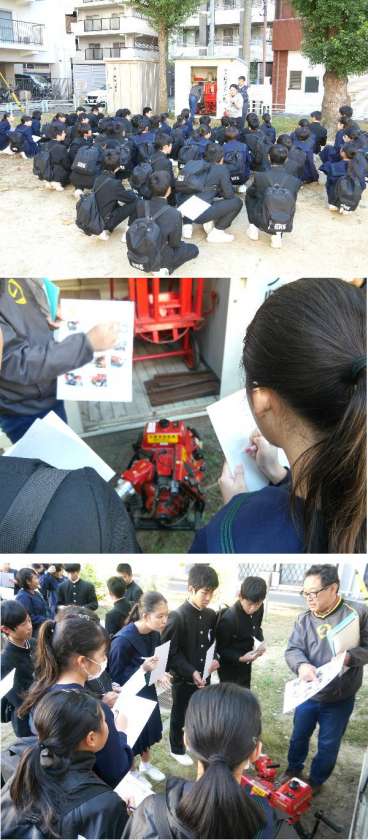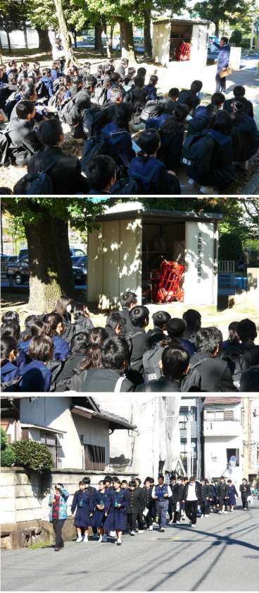 4つのグループに分かれて、新東三国小学校の備蓄倉庫と東三国中学校の備蓄倉庫をしらへたり、東三国東公園や十八条東公園、東三国西公園にある消防ポンプ倉庫どを調べました。