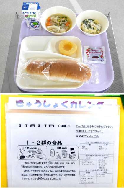 今日の献立は、大型コッペパン、スープ煮、ほうれんそうグラタン、いちごジャム、白桃(缶)、牛乳でした。