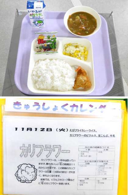 今日の献立は、えびフライカレーライス、カリフラワーのピクルス、豆こんぶ、牛乳でした。皆の好きなカレーライスおいしくいただきました。