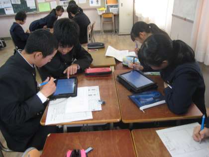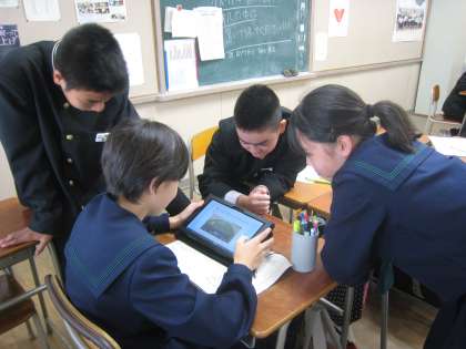 明日はいよいよ校外学習です。2年生は、大阪市内フィールドワーク!グループでまとまり、全線乗り放題のエンジョイエコカードを使って、大阪市内の施設をまわり、最後にエイジレスセンターで学習をします。今日はその事前指導とその回るところの打ち合わせをタブレットを使って調べています。