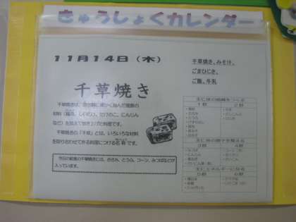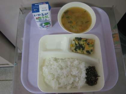 今日の献立は、千草焼き、みそ汁、ごまひじき、ご飯、牛乳でした。