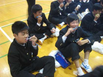 今日は、東三国中学校の歯科校医さん呉城先生を講師としてお招きして、歯と口の健康教室を行いました。この日のために保健委員がくれしろ歯科医院まで行き、どのような内容でお話をしてもらうか、みんなにわかるような説明ができるかなど、事前学習と準備をしました。保健委員の人ありがとうございました。今日の話を聞いて、しっかり歯磨きの習慣をつけてください。本日は、呉城先生ありがとうごさいました。
