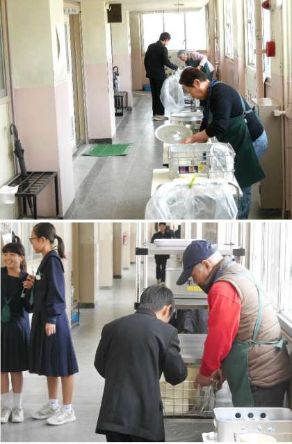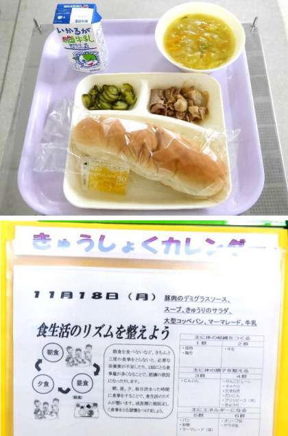 今日の献立は、大型コッペパン、豚肉のデミグラスソース、スープ、きゅうりのサラダ、マーマレード、牛乳でした。今日も元気アップボランティアさんに支援いただいています。ありがとうございます。