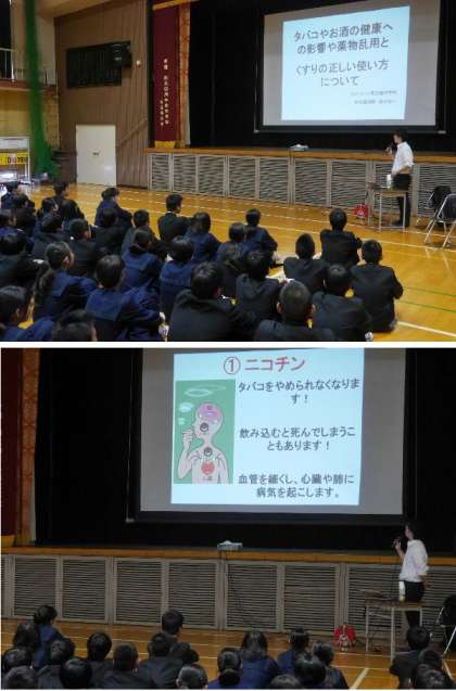 2年生で薬物乱用防止教室があり、本校の校医の薬剤師さんから、喫煙や飲酒、薬物についての講話をいただきました。