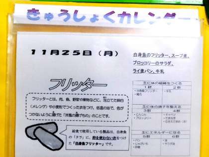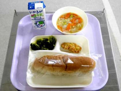 今日の献立は、ライ麦パン、ブロッコリーのサラダ、スープ煮、白身魚のフリッター、牛乳でした。