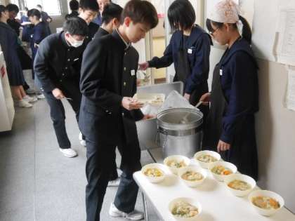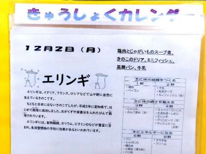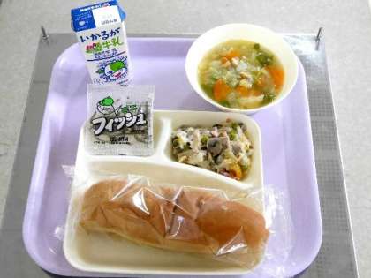 今日の献立は、黒糖パン、鶏肉とじゃがいものスープ煮、きのこのドリア、ミニフィッシュ、牛乳でした。