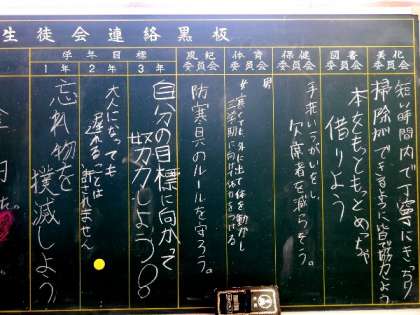 階段にある生徒会連絡黒板に先日おこわれた各種委員会できまったことが書かれました。