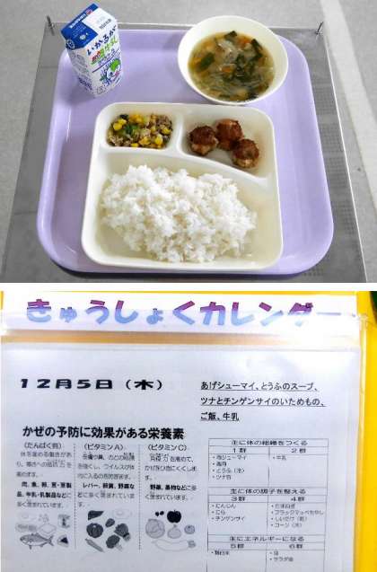 今日の献立は、ご飯、あげシューマイ、とうふのスープ、ツナとチンゲンサイのいためもの、牛乳でした。今日もたくさんの元気アップボランティアさんにきていただきました。いつもありがとうございます。