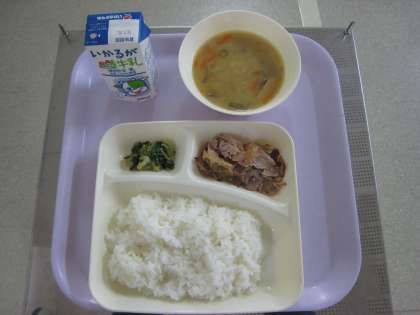 今日の献立は、豚しょうが焼き、さつまいものみそ汁、きくなとはくさいのごまあえ、ご飯、牛乳でした。