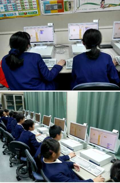 新東三国小学校のドリーム授業に小学4年生〜6年生が集まりました。パソコン室で、東三国中学校の校長先生がプログラミングの授業を行いました。児童たちは楽しそうに、猫のキャラクターを動かしたりしゃべらせたり、なかせたりして楽しんでプログラミングをしました。