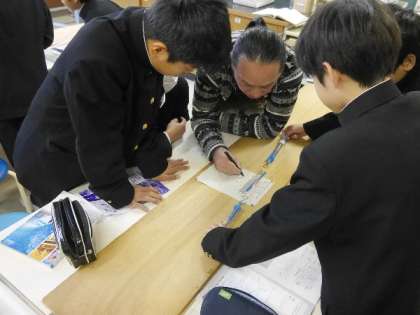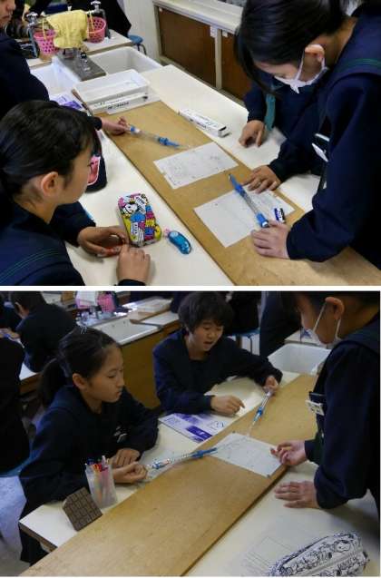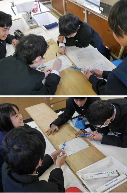 1年生が理科室で実験をしています。力がつり合うための条件を、、ばねばかりでひっぱりあって、力を測りながら作用線を書いて確認しています。