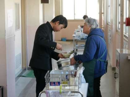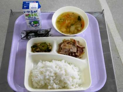 今日の献立は、ご飯、焼き肉、五目汁、きゅうりともやしのおひたし、焼きのり、牛乳でした。元気アップボランティアさんやさしく声をかけてもらっています。ありがとうございます。