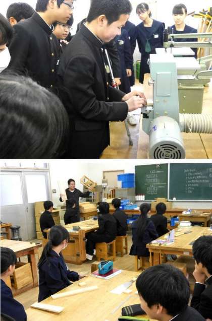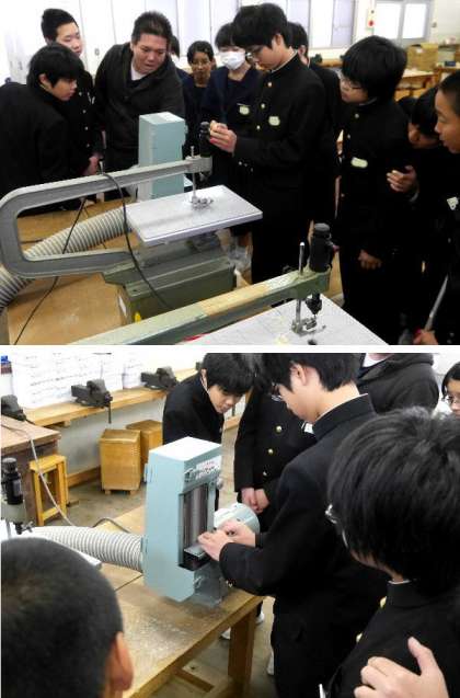1年生の技術では板材を使って製品を作ります。ベルトサンダーの使い方を教えてもらっています。