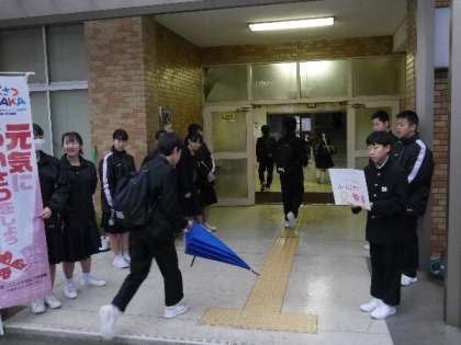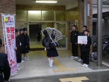 生徒会の風波委員が朝のあいさつ運動をがんばっています。