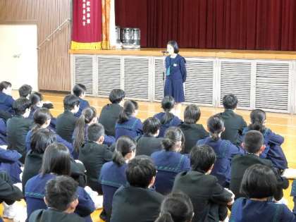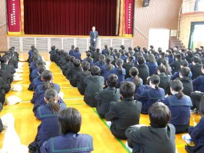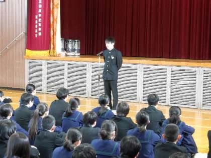 今日の全校集会では、校長先生から、先週に懇談が終わり、学習については「させられる」から「する」へに意識転換する必要についてお話しました。また、「かけがえのない自分」を大切に気持ちをもつ大切さについてお話しました。