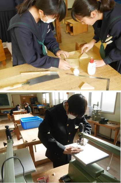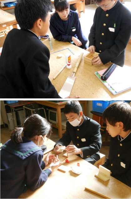 1年生の技術科では、板材を使って、設計して製品を作っています。