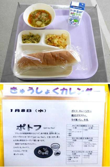 今日の献立は、ライ麦パン、牛乳、ポトフ、カレーソテー、桃のクラフティでした。