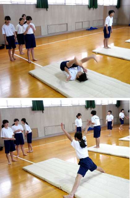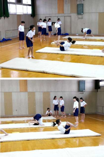 1年生の女子は格技室でマット運動の練習をしています。開脚後転はむずかしいですね。