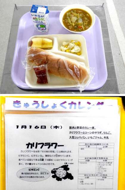 今日の献立は、大型コッペパン、いちごジャム、カリフラワーとコーンのサラダ、りんご、豚肉と野菜のカレー煮でした。いつも元気アップボランティアさんありがとうございます。