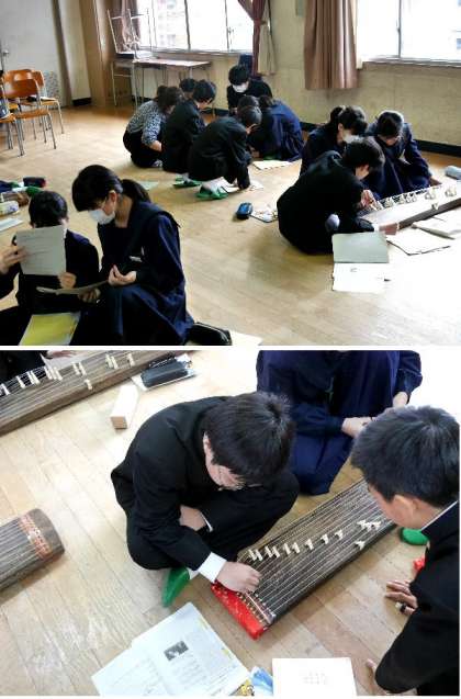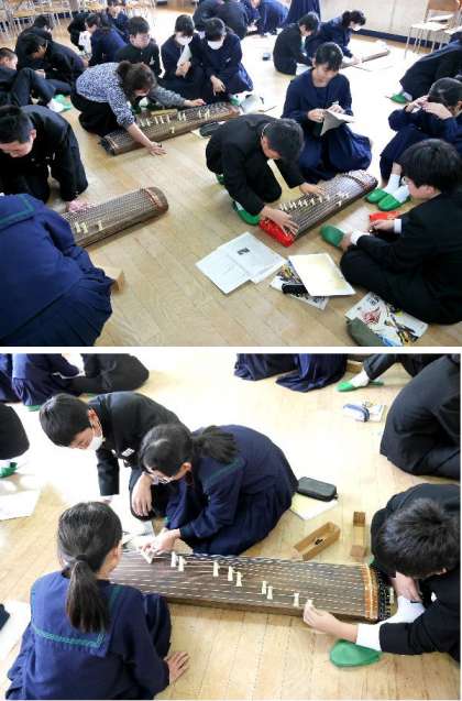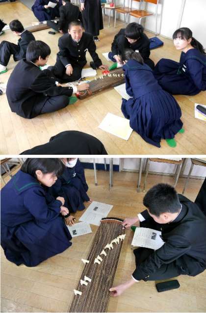 1年生の音楽では、琴を弾く練習をしていました。柱をたてて、ただしい音を鳴らせるのは少し大変ですが、楽しく音を出していました。