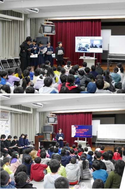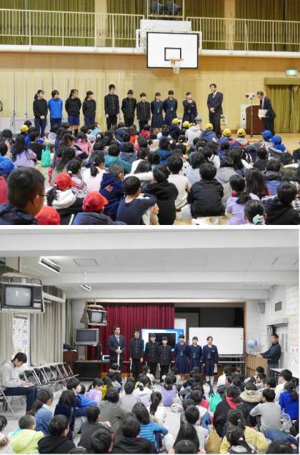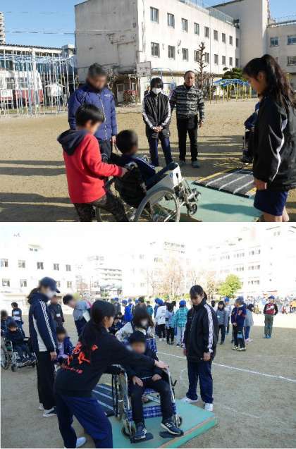 東三国小学校の土曜授業で防災学習会が行われ、東三国中学校のジュニアリーダーが参加し、車いす体験のお手伝いや、東北ボランティア研修の報告を行いました。