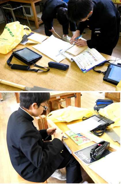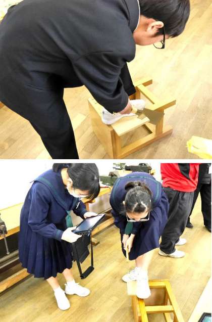 1年技術科では木材をつかって作品をつくっています。のこぎりでまっすぐ切断するのはむずかしいですね。