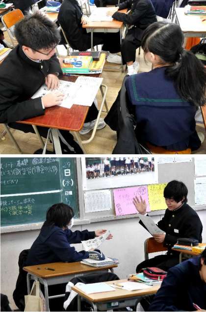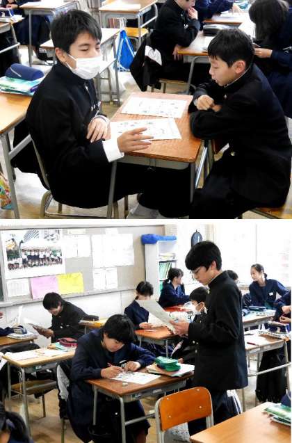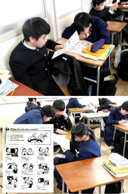 1年生の英語では、ペアになって音読練習をしています。いろんな場面に英文を変化させて、「いつするんですか」と聞いているんですね。