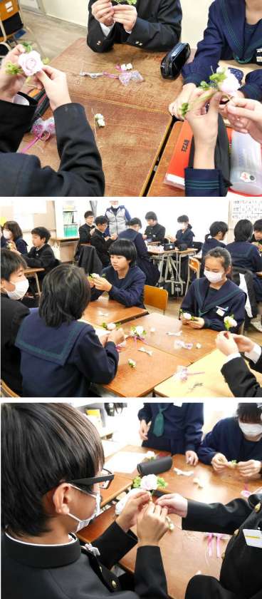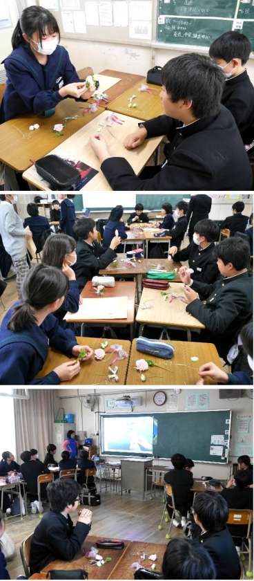1年生では、卒業式の胸につけるコサージュをつくりました。コサージュ委員会の生徒たちが、それぞれの学級で皆に教えています。作り方ビデオで確認をして、班で教えあっていました。卒業生への想いをこめて出来上がります。