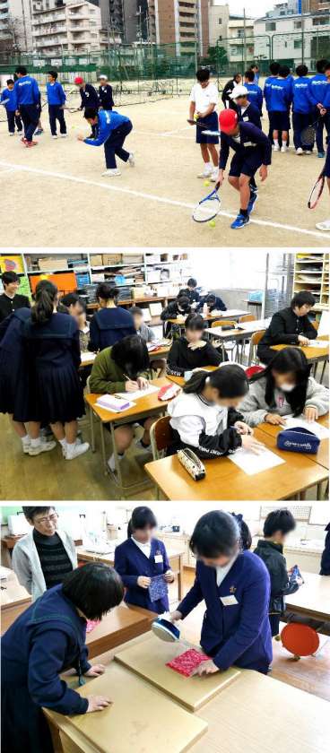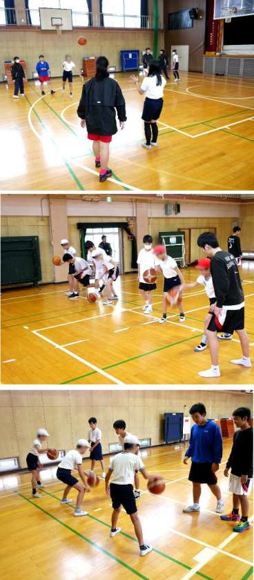 中学校での生活の説明が終わり、いよいよ部活動体験です。運動場では、野球部、テニス部、陸上部が体験をしています。美術室では美術部、被服室では手芸部の体験です。体育館では男子バスケットボール部と女子バスケットボール部が体験をしています。先輩の中学生がていねいにやさしく教えています。
