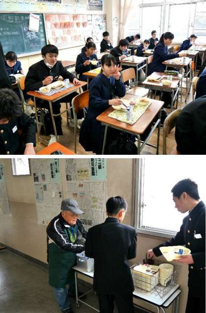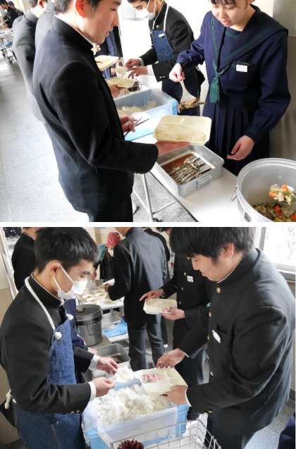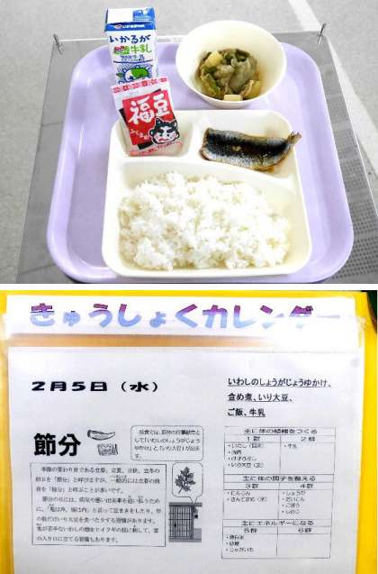 今日の献立は、ご飯、牛乳、いわしのしょうが醤油かけ、含め煮、いり大豆です。一昨日の節分にちなんだ献立です。いわしの小骨に気を付けていただきましょう。
