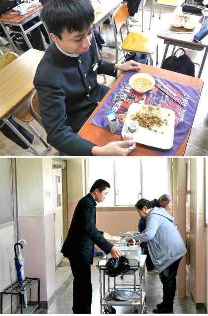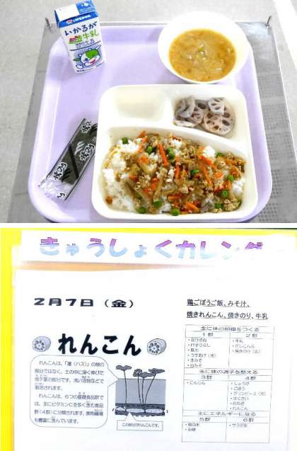 今日の献立は、鶏ごぼうご飯、焼きれんこん、焼きのり、みそ汁、牛乳でした。
