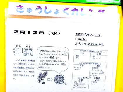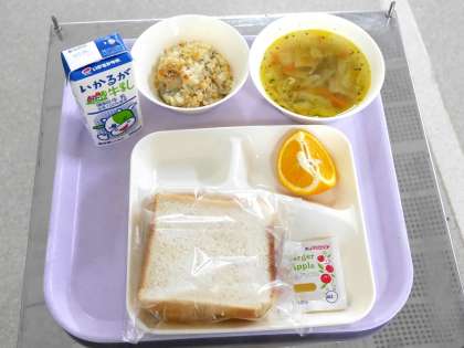 今日の献立は、食パン、りんごジャム、牛乳、押麦のグラタン、スープ、いよかんでした。