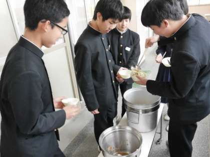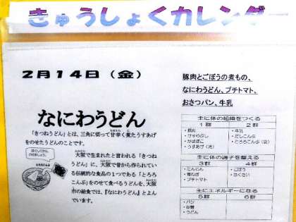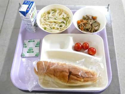 今日の献立は、おさつパン、牛乳、なにわうどん、プチトマト、豚肉とごぼうの煮ものでした。うどんのおかわりが多かったです。うどんに、とろろこんぶがついています。