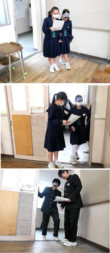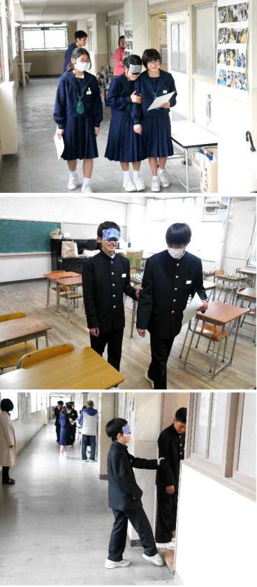 1年生は視覚障がいについて学習しました。アイマスクをつけて、歩いたり段差をぬける体験も行われました。実際に体験してみて、改めて視覚障がい者の方々の苦労などが理解できます。また、案内をしていくのも工夫が必要ですね。安心してお互いに住みよい街をつくっていくために知ることが大切です。
