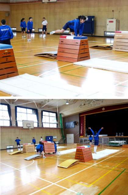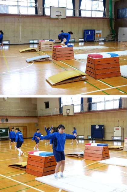 2年生の女子の体育は、体育館でとび箱の練習です。跳んだあとのきめポーズが大切です。この後に8段まで跳ぶテストが行われました。