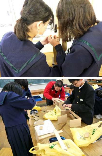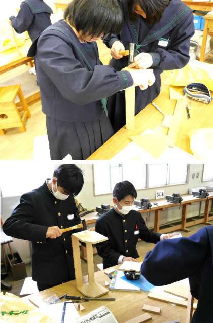 1年生が板材で作品をつくっています。いよいよくぎ打ちです。まっすぐに打ってくださいね、