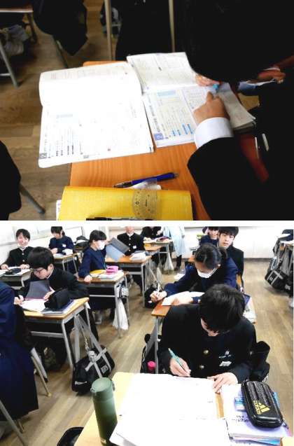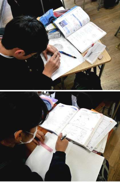 明日から、1・2年生は学年末テストとなります。1年生の数学の授業では、テストにむけて練習問題に取り組んでいます。