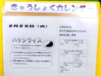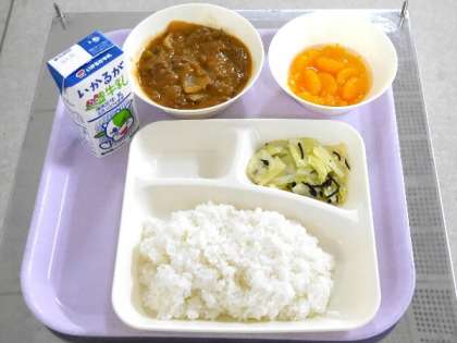 器用の献立は、ハヤシライス、キャベツのひじきドレッシング、みかん(缶)、牛乳でした。