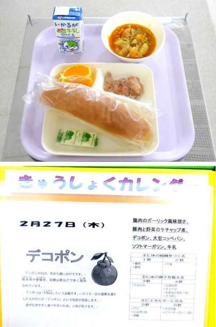 今日の献立は、大型コッペパン、牛乳、鶏肉のガーリック風味焼き、豚肉と野菜のケチャップ煮、デコポン、ソフトマーガリンでした。給食は3年生だけです。3年生は元気いっぱいです。