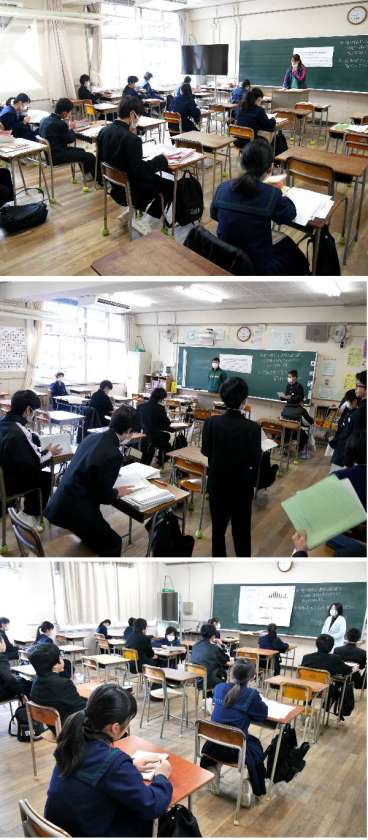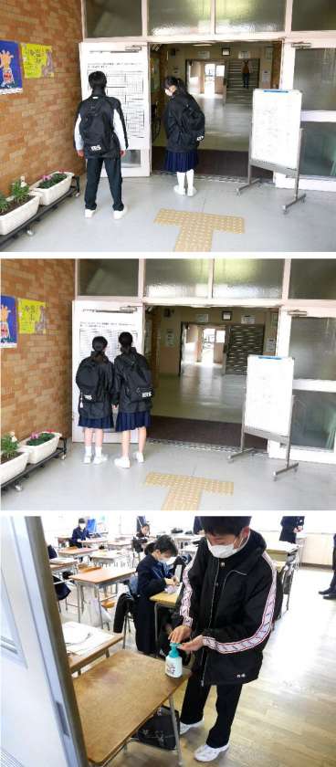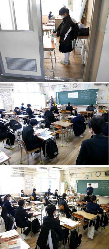 午前9時、1年生が登校して、南館3階の5教室に分かれて、テスト返しなどを行いました。席をあけて着席したり、アルコール消毒、教室の換気をしながらのテスト返しとなりました。