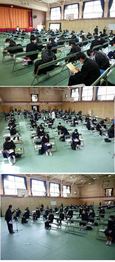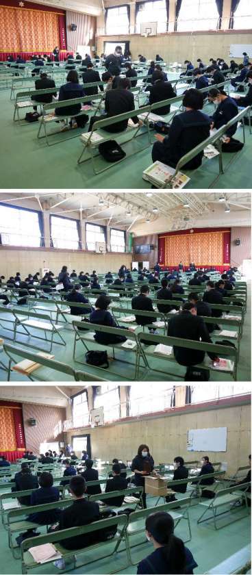 1年生は午後2時から、2年生は午後3時30分から、体育館に登校してもらい、休業延長の説明や健康観察表の確認など行いました。配布プリントもたくさんあり、教育委員会からの休業延長のお知らせもお渡ししました。