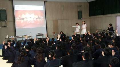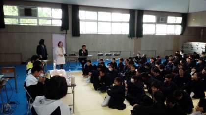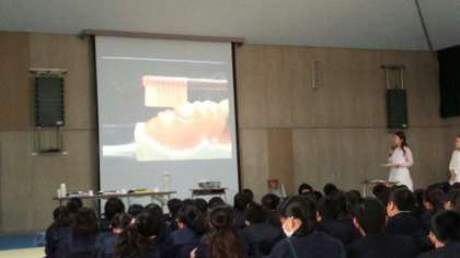1年生の6限の授業は、歯科衛生士さんたちによる「歯と口の健康教室」が行われました。