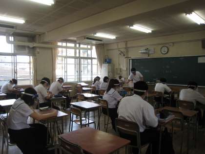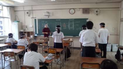 さて、本日は、蒸し暑く感じる日になりました。そうした中で、今日からは感染防止のためのフェイスシールドをつけての授業になりました。はじめてつけたので戸惑いながら、またなれない中で授業を受けていました。