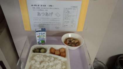 中華煮 あつあげのピリ辛じょうゆかけ きゅうりの中華あえ ごはん 牛乳